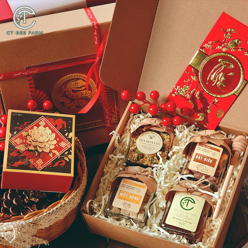 - Tặng kèm 1 túi giấy và thiệp Tết đi kèm